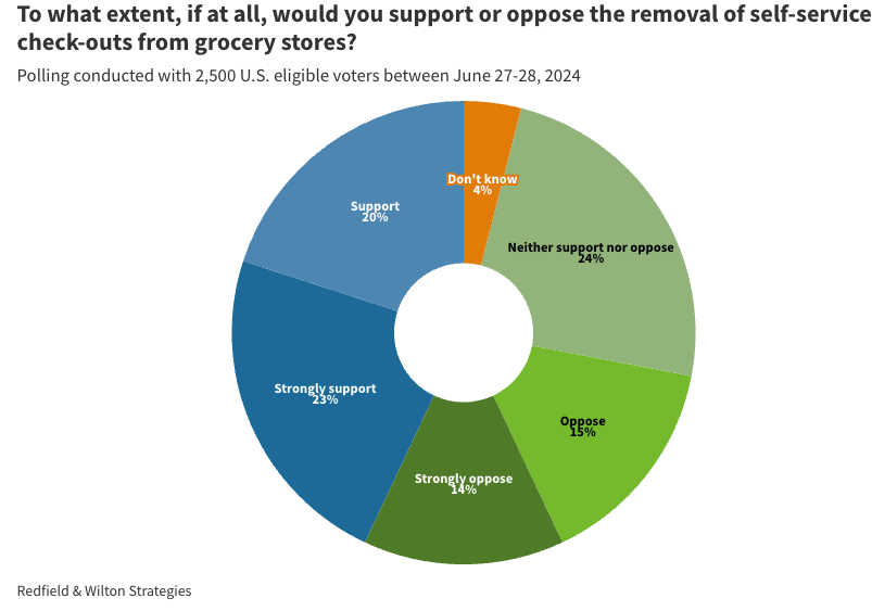The survey, conducted in late June among 2,500 U.S. voters, found that the main reason for disliking self-checkouts is job loss (62%), followed by a preference for personal interaction (40%) and the inconvenience of machines not accepting cash (27%).