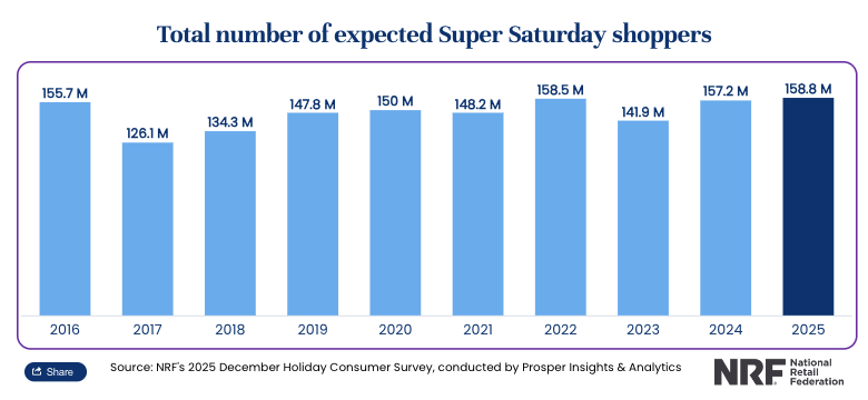 Nearly 159 million consumers plan to shop on Super Saturday, the final Saturday before Christmas, according to a new National Retail Federation survey, setting a new record and edging past last year’s total. The event, which falls just five days before Dec. 25 this year, remains one of the most important days of the holiday season for retailers. NRF says shoppers will spread their purchases across stores and channels as they rush to pick up last-minute gifts and remaining holiday essentials.