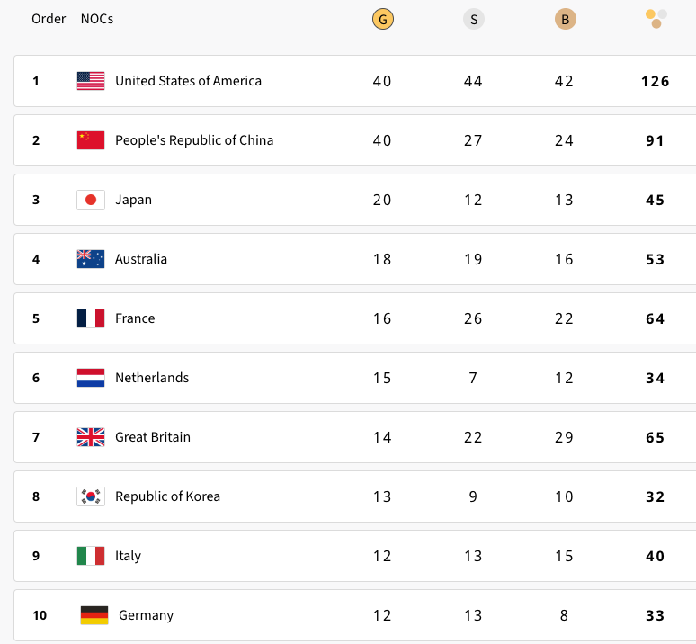 The 2024 Olympics dominated the majority of the media scene this week with the United States taking the lead with overall medal count, and sharing the top spot with China in Gold medal count. The top 10 can be seen below: